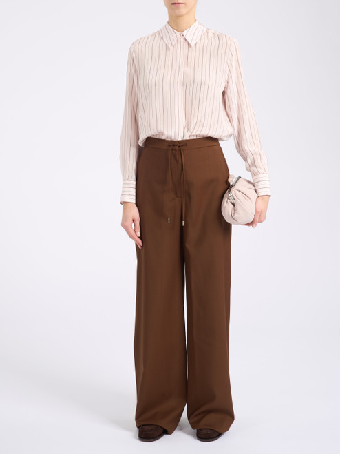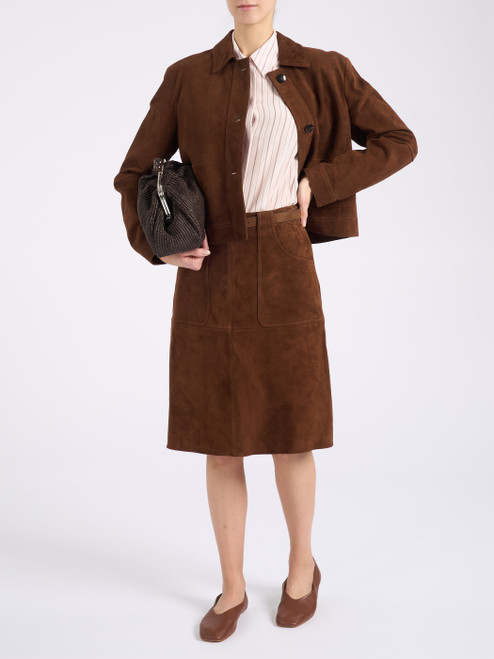 Giacca Max Mara Studio modello Mstbaia realizzata in camoscio color cioccolato. Linea boxy con taglio crop in vita. Caratterizzata da tagli e impunture stile pelletteria.