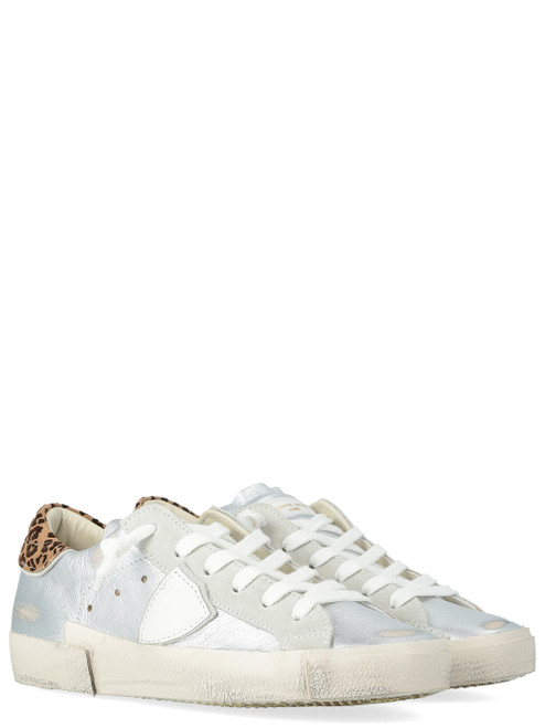 Philippe Model sneakers in silver glitter. Featuring a fluorescent yellow heel tab and side shield in crackled leather. With beige suede inserts and leather logo on the tongue.